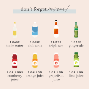 Mixers are the magic that brings your cocktails to life! Don’t forget to include these nonalcoholic pours into your bar and budget, but feel free to customize given your crowd, how much alcohol, and of what kinds that you’ll be going with. Gin needs tonic and rum needs coke, so don’t let mixers slip your mind.