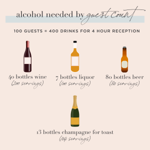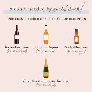 For a typical four-hour reception, you can expect a smaller crowd of 50 or so guests to enjoy around 200 drinks. We divvied this up according to the alcohol ratios above, but you can add to or take away from any category you’d like. The reception time also affects how much alcohol to serve. If you’re having a brunch wedding or tying the knot in the early afternoon, guests will be less inclined to drink than at a nighttime celebration.