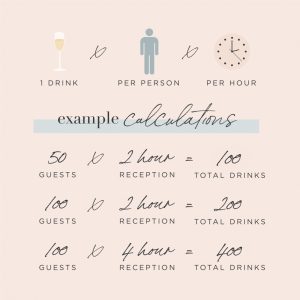 For a big wedding, we say to pump up the volume a bit. Following the amounts laid out in our wedding alcohol calculator will take the guessing out of planning your wedding alcohol numbers. This will put your mind at ease and you can relax knowing that the math was done for you by professionals who have seen a million weddings and know all the ins and outs!
