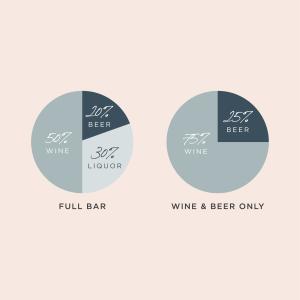 Know your crowd! If your people are wine and beer only, ensure that you stock up on plenty of reds and whites as well as a few lager options. If your wedding involves serving a full bar, these are the ratios we suggest to hit all your bases. Personalize your choices of liquor or beer to truly cater to every crowd!